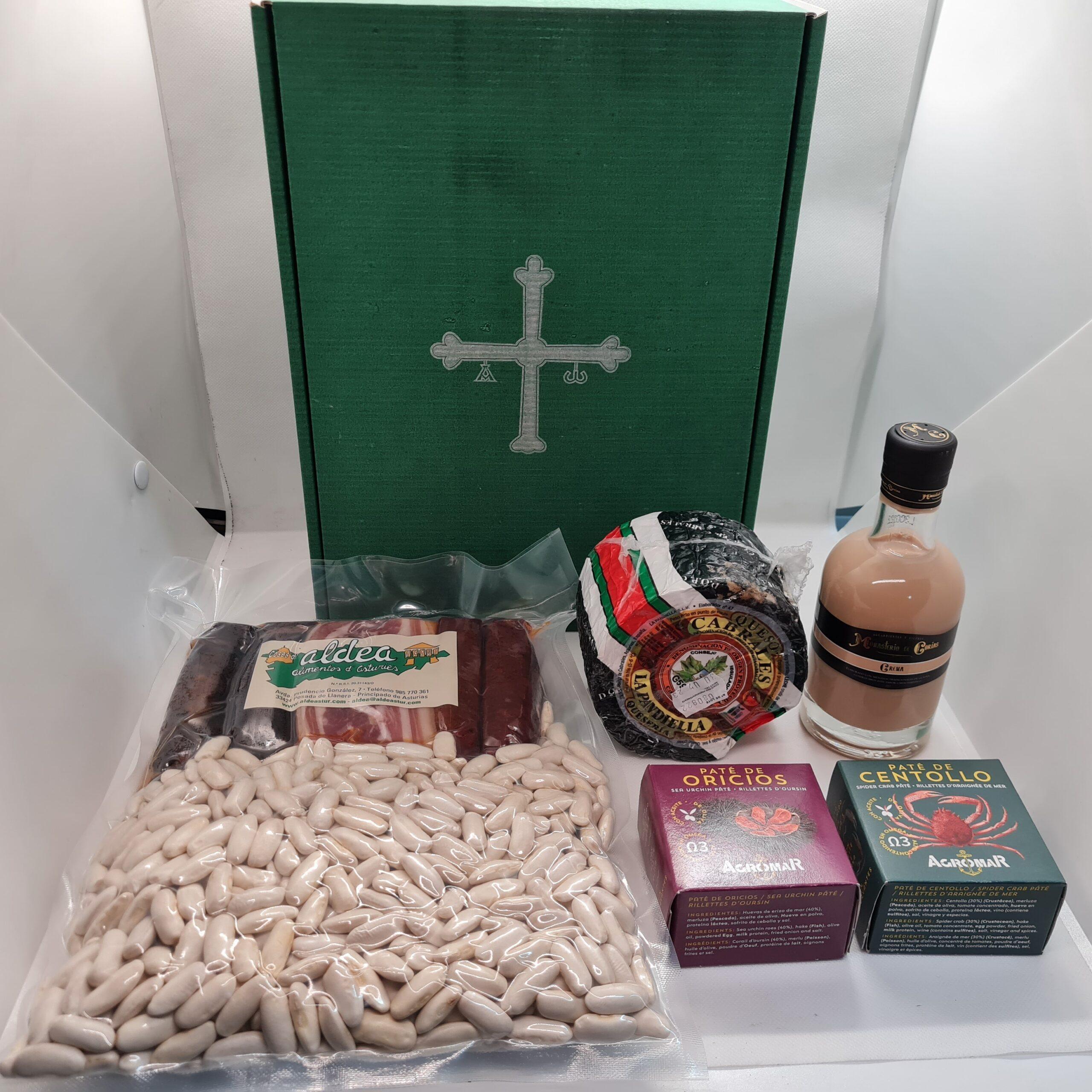 CAJA DELICATESSEN ASTUR 1 – Caja Cruz de la Victoria con Preparado de fabada para 4 personas, licor de crema de orujo Monasterio de Corias 200 cl, paté de centollo, paté de oricios y queso Cabrales.