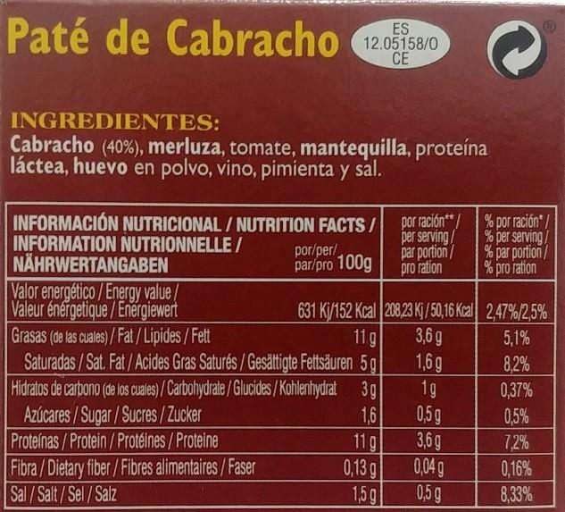 INGREDIENTES: Cabracho (30%), merluza, aceite de oliva, tomate concentrado, huevo en polvo, sofrito de cebolla, proteína láctea, vino, sal, vinagre y especias. Alérgenos: pescado, huevo, lácteos, sulfitos. INFORMACIÓN NUTRICIONAL PATÉ DE CABRACHO: