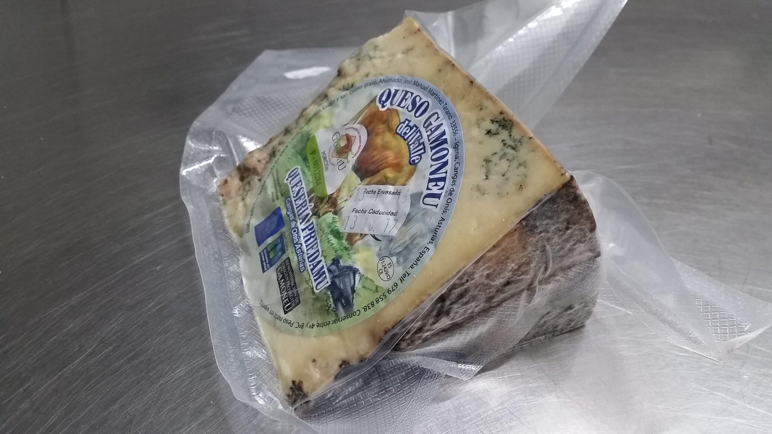 Cuña de queso Gamoneu del Valle. Queso graso ahumado, hecho en la zona de los Picos de Europa con leche cruda de vaca, fermentos, cuajo y sal. Catalogado como uno de los mejores quesos de Europa. Semiduro, veteado, seco y ahumado. Sabor intenso y algo picante. Peso aproximado: 400 gr. – El kg. sale a 35.50 €