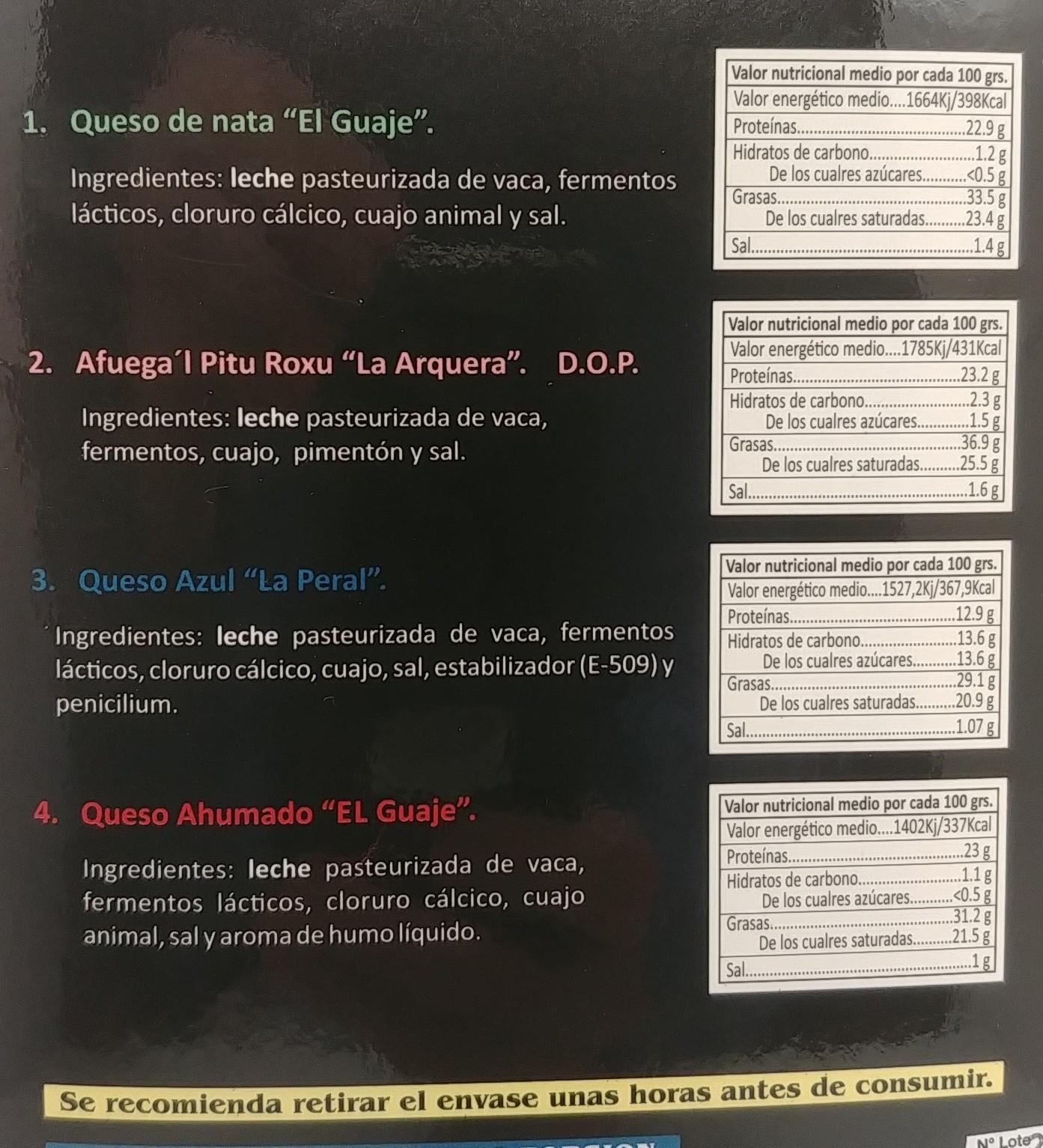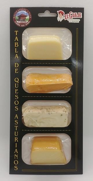 INGREDIENTES: Queso artesano de Nata «El Guaje», Queso artesano ahumando «El Guaje», Queso Afuega’l Pitu Roxu «La Arquera» D.O.P. y Queso Azul «La Peral» – Peso aprox: 250 grs.